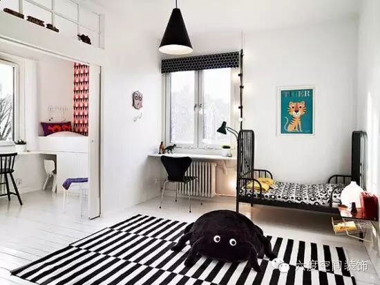 小编点评:依然是黑白为主的空间色调,却处处给人强烈的童趣,斑马条纹的地毯、神秘蜘蛛、卡通老虎、恐龙摆件、墙上面具挂件,就连窗户,也是蜂巢的味道。