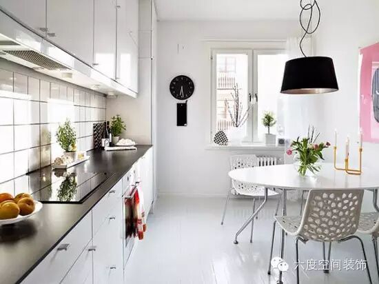 小编点评:餐厅是最能体现家居品味的地方。光洁透亮的餐桌、造型独特的餐椅、黑白对比鲜明的吊灯的加入,五颜六色的小盆栽,让这个厨房与餐厅充满了现代而自然的梦幻感。