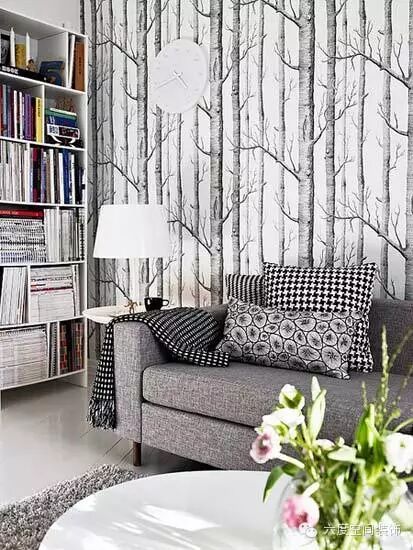 小编点评:本以为北欧人偏爱木材家具,竟然连客厅整扇背景墙都赋予了天然的林木意境,淡雅的灰与黑,深灰的布艺沙发,在玻璃桌上时花的映衬下,仿佛身处大自然之中。