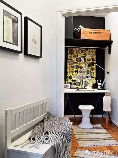 小编点评:尽管空间有限,在书桌台之外,适宜地放了一张靠背长椅,走读坐读皆相宜,地面铺有柔软的地毯,色彩丰富而不凌乱,一种宁静舒适油然而生。