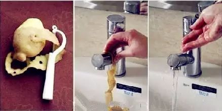 削完的土豆皮就派上用处了!用贴着肉的那一面擦拭脏龙头,效果显著。
