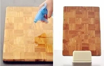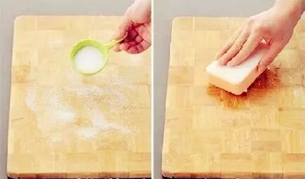 先用洗洁精把案板洗净,然后撒一勺子盐,用洗碗海绵蘸一点点水,就着盐反复擦洗案板表面(大约30秒)。洗净后再将白醋和水,按1:2的比例,调好装入喷壶喷在案板表面,喷完无需再清洗了,放在通风初自然风干即可。轻松有效,杀菌消毒除异味!