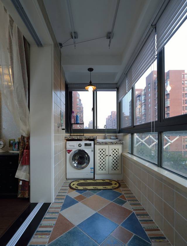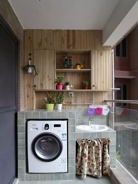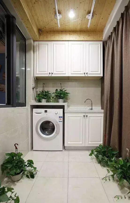 洗衣机往往无处安放,有人放在卫生间,有人放在厨房,不妨在阳台打造一个专属洗衣房,与晾衣区合二为一,同时根据布局,设计成套储物柜系统,让阳台变得一体化。