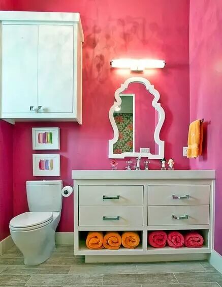 ▲粉色的墙壁搭配白色的镜柜、洁具,满满的少女风,家有小公举,再硬的汉子也磨成绕指柔。