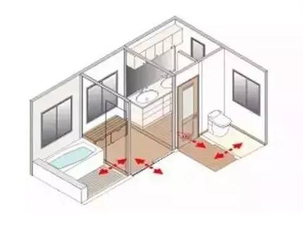 这种做法比较类似国内最近开始流行的干湿分离的做法。占用空间并不大,但是能够比较有效的阻止水蒸气灾害啦。