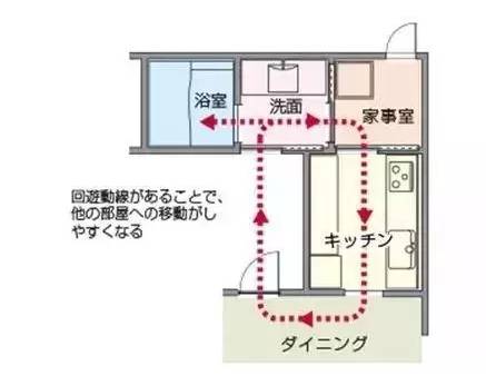 下面这个布局中的卫生间被彻底分离开,而将浴室、洗面、家务室和厨房结合在一起形成了一个便利的环线: