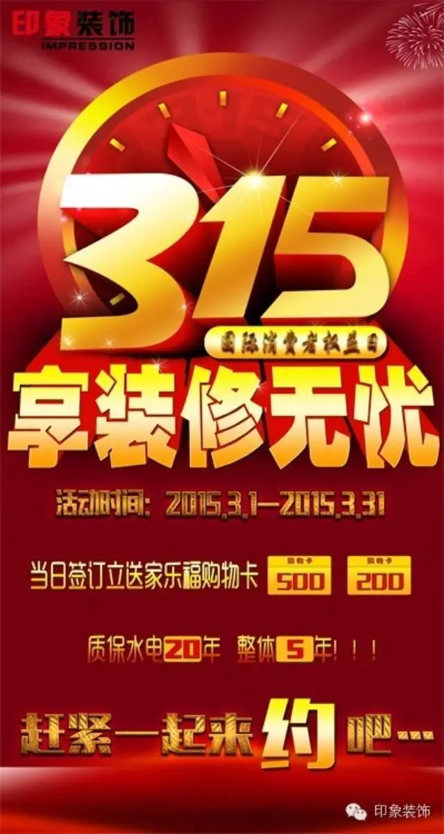 3、家装讲座(15:00——16:00):由印象装饰总经理介绍公司产品和服务,以及315特别质量保障计划等;