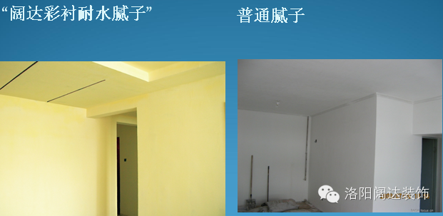 “阔达彩衬”耐水腻子以着色工艺彻底消除了乳胶漆质量控制的难点。使用“阔达彩衬”耐水腻子后,形成黄色的墙面基底,对乳胶漆涂饰产生自检功能:乳胶漆兑水超过比例、涂刷遍数不够时,就不能遮盖黄色的墙面基底,质量问题自然暴露无遗。