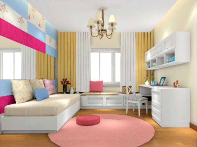 色彩艳丽的蓝粉拼接使整个房间多了一丝少女情怀,明亮的白色书架有隐藏了多少少女般彩虹似得梦。