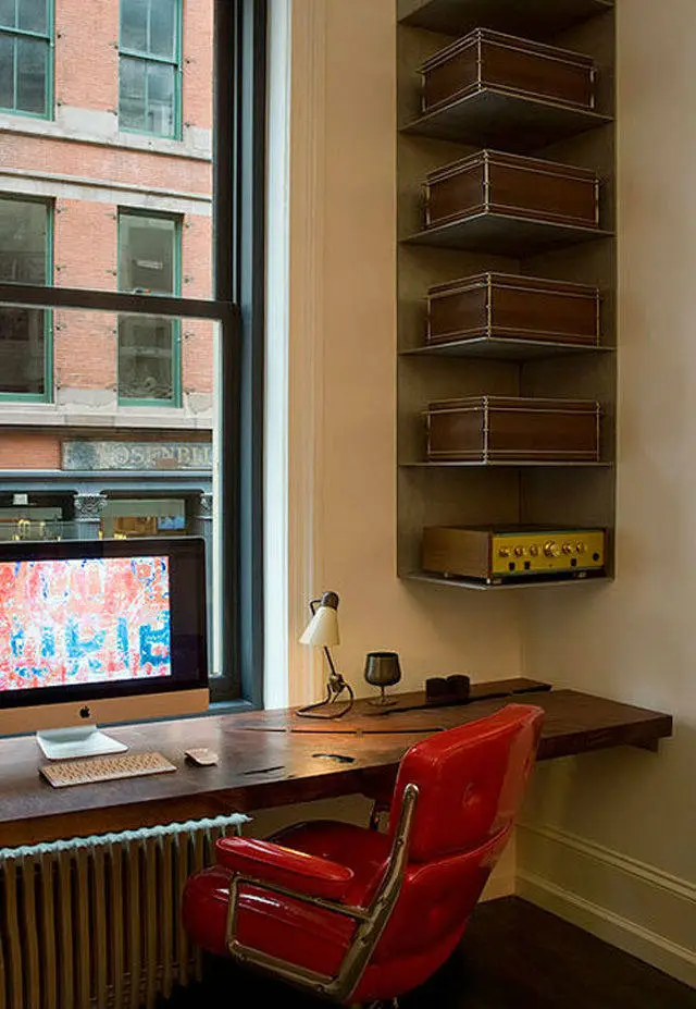 狭小的空间若是没有地儿安放书架,那就在墙角安置一个。而对于家具进行转角设计,是攻克墙角旮旯的最棒方法,看,紧贴的着墙角的部分被白色转角书架填满,在这儿,就可以收纳一定量的书籍。