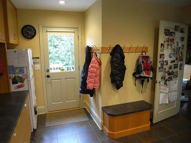 玄关处的收纳,要根据空间大小而定夺,对于空间极小的小户型,墙面收纳则是不错之选,而挂钩则更为简单易行,紧贴凸墙角打造的挂钩收纳区,让收纳设计更为连贯,为家人出入带去不少便捷。