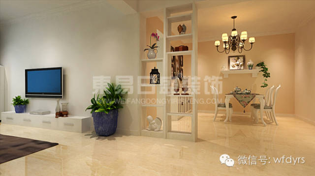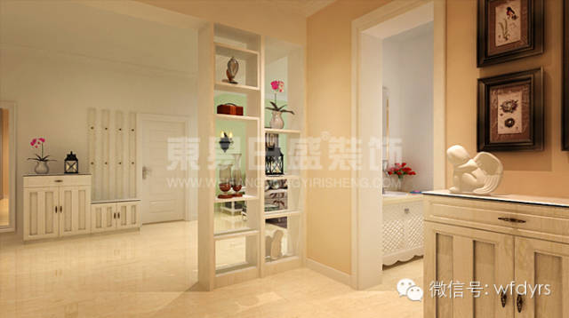 门厅(玄关):本套房屋的门厅不是封闭的,而是半开敞的隔断,通过我们对房屋的实地踏勘,我们发现从风水角度讲,这个门厅应封闭起来,面向入户门的一面用漂亮的、似通非通的隔断装饰,下面是悬空式的储物柜柜,鞋柜高0.75米,既满足了储物柜的功能,又不会让这个小空间更显局促,通过光影使其更具层次感。