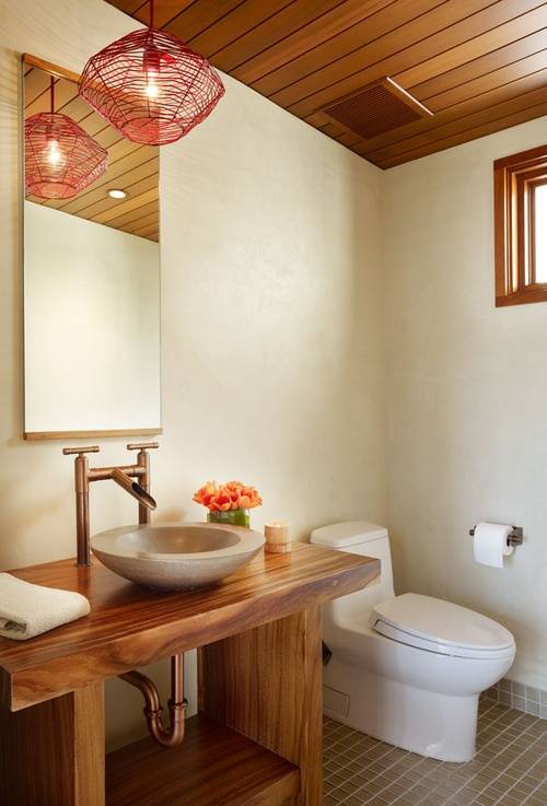 原木,是自然中最原始的材质。在卫生间里用木材装饰,那些天然的色彩和斑驳的纹路,可以让人嗅到森林的气息。大量木质材料的运用和绿色植物有效搭配,还有宽阔的室内空间和良好的采光,让整个卫浴环境散发着强烈的家庭气息和野外乡村风情。