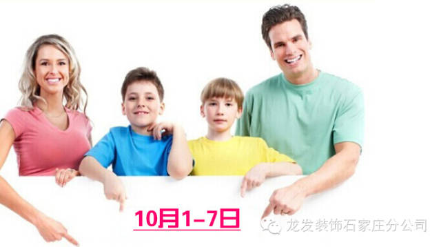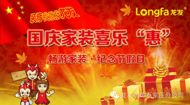 在国庆小长假龙发装饰为您准备了为期2天的“龙发国庆家装喜乐会”,我们期待您的莅临,来到龙发我们一起为祖国庆生。一年一度的国庆也象征了家装行业的又一次风暴!国庆假期与其出去拥挤在人潮中,不如留意身边的惊喜,龙发装饰携手网络媒体为您打造一个充满惊喜与欢乐的国庆家装喜乐“惠”。