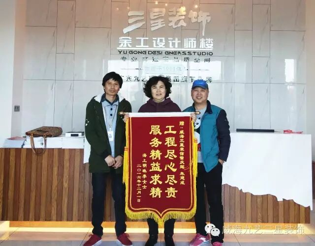◆海上明珠李阿姨来到三星装饰,用一面写有『工程尽心尽责 服务精益求精』的锦旗表达了即将入住新居的喜悦以及三星装饰为自己实现美居梦想的感谢,工程负责人朱建成、设计总监曾庆辉及工作人员热情地接待了李阿姨。