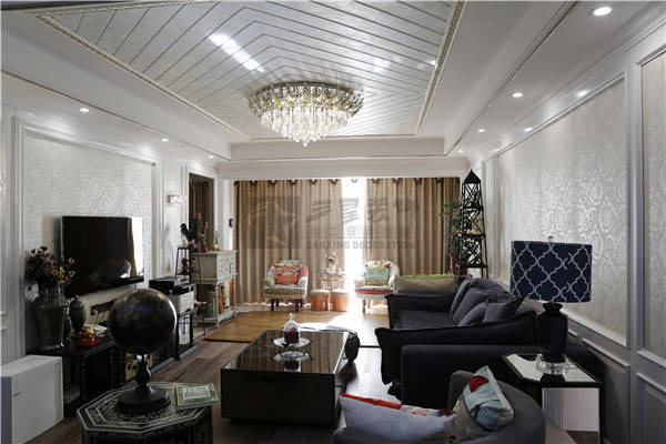 整个客厅采用大面积的白色护墙板与米色图案壁纸组合,奠定了整个居室清新的设计风格,家居则采用对比强烈的深色,从视觉上制造一个跳跃。客厅构造方正,造型上推崇对称,吊顶则采用斜对角的石膏板拼条喷艺术涂料,丰富空间层次,强化视觉效果。