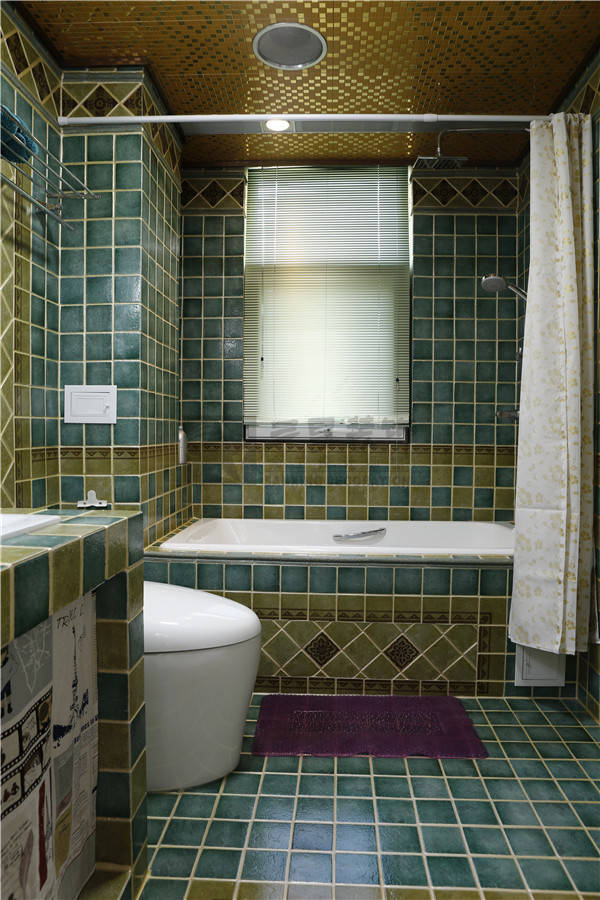 卫生间与众不同的是浴缸及洗手台都是砖砌的,嵌入式浴缸以及方正的洗手台与整个卫生间浑然一体,绿色与黄色的小方砖规则或不规则的搭配,让整个卫生间匠心独具。