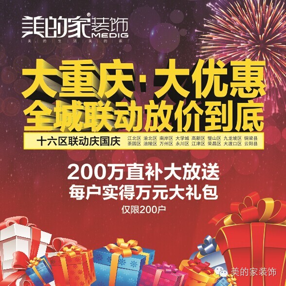 9.16—10.16【大重庆·大优惠,全城联动放价到底】携带着美的家装饰200万直补大礼包来到了这座古老的城市,每户将在这期间获得万元大礼包。