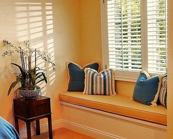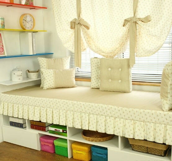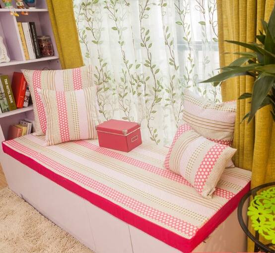 用木工板做台面主要是不冷,看起来比较简洁,缺点是时间长了容易被阳光晒变形,万一遇到窗户打雨还容易受潮,到了冬天飘窗上还会有不少的冷凝水 滴流到台面,也会使木工板的台面受潮变形。桑拿板在防潮的方面就解决了木工板的缺陷,但是桑拿板颜色单一,还要用其他布艺之类的进行装饰。