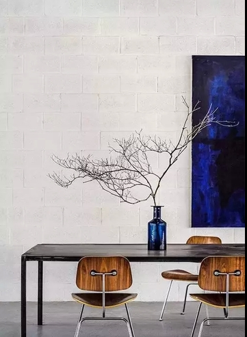 ►荧光蓝的瓶子和壁上的画幅相映衬,一段舒雅有序树枝置于瓶中,映衬在白色砖墙之上。桌椅均是深色木,一切浑然天成。