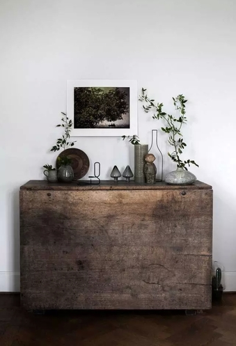 ►蕴藏历史沧桑的柜子,厚实质朴,上面的器物也同样暗合柜子的颜色,高矮大小不规则的容器里是绿色枝叶。由下到上渐渐轻盈,在升华中感受自然的韵味。