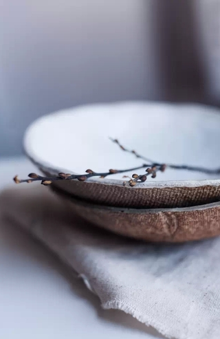►一段树枝,待生的叶芽,包裹在褐色的薄壳里面。置于浅浅的食器中,几分禅意,几分春意。