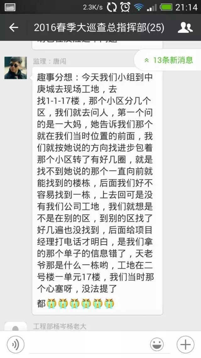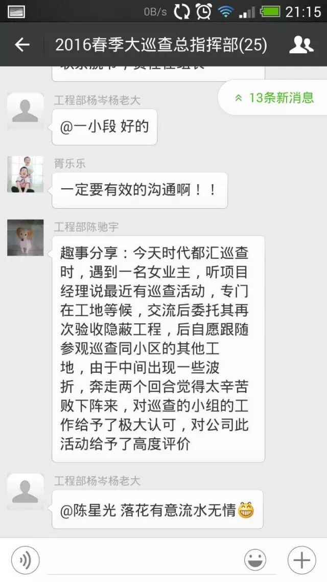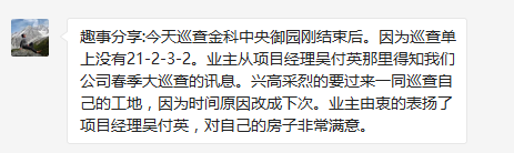 每一天的巡查,各个小分队都会发生一些有趣的事情,不管是跟业主之间的互动,还是在巡查的间隙的趣闻。巡查本是一件累人的事情,更何况要在有限的时间内,把乐尚所有在建工地全部巡查完毕。所以我们每一个巡查的小分队都会把每天碰到的有趣的事情,通报给大家,激励自己也鼓舞整个团队,累并快乐着。