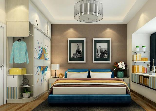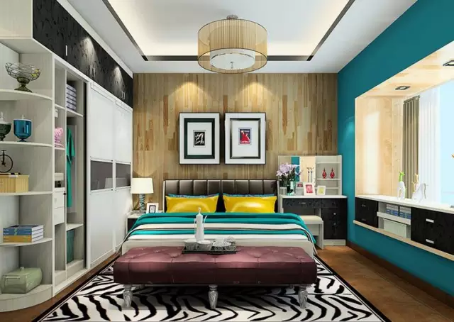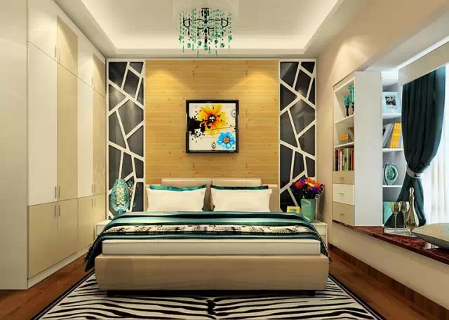 蓝黄米三色组成的色彩条纹为卧室空间奠定活泼炫丽的基调。利用窗台长度定制的半开放书柜,可以存放部分书籍,飘窗里侧还设置隔板,可以摆放各种小物件。