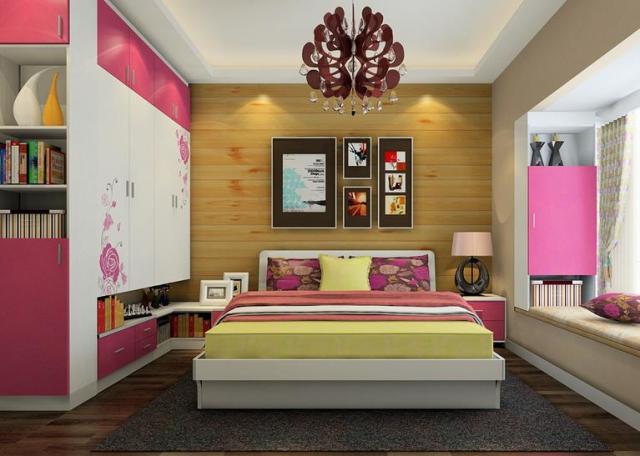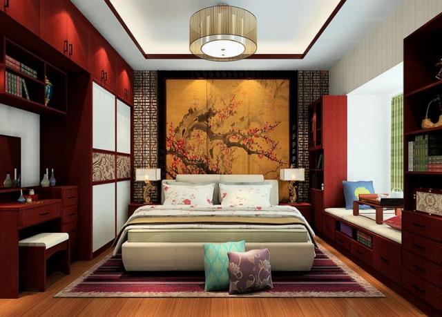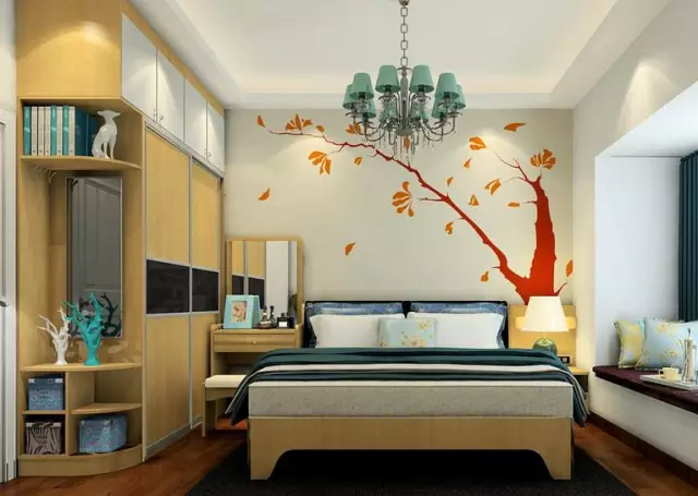 红色面板搭配红色花藤,清新亮丽,让人眼前一亮。衣柜采用半开放式,衣柜下方架空并设置转角,让床头柜与收纳柜连成一体,使得衣物收纳和书籍杂物收纳都得到了满足。