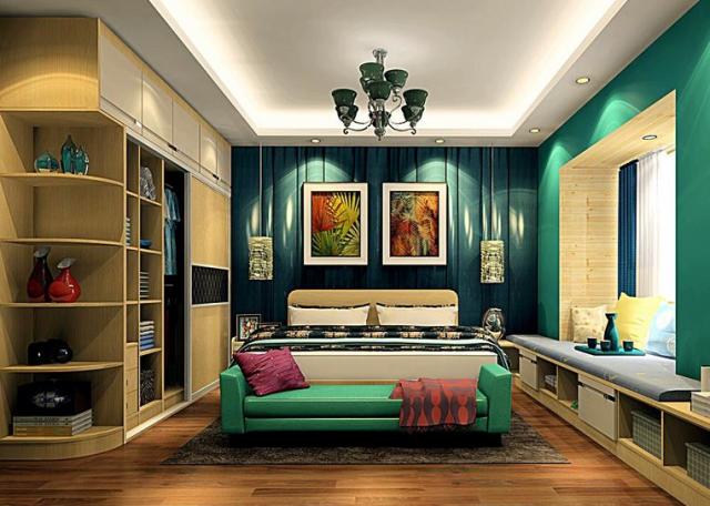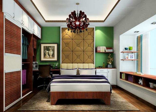 曲柳原木纹理搭给人以回归大自然的原始感,搭配绿色的装饰品及墙壁绿色调,让空间充满时尚感。根据窗台深度以及卧室长度定制的塌塌米填满窗台空间,并扩大了休闲区的面积。