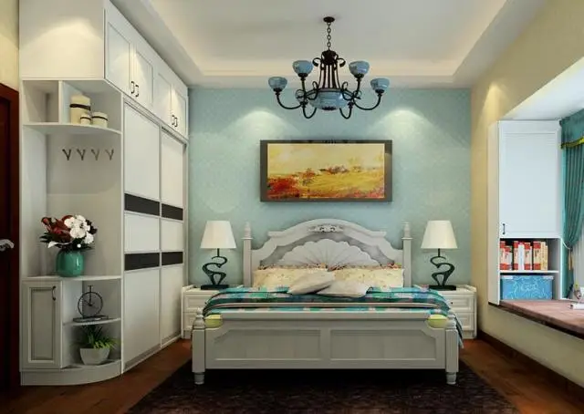 古典造型的大床以及线条优雅的衣柜,配合复古的蓝色玻璃吊灯,让整个空间显得清新优雅。