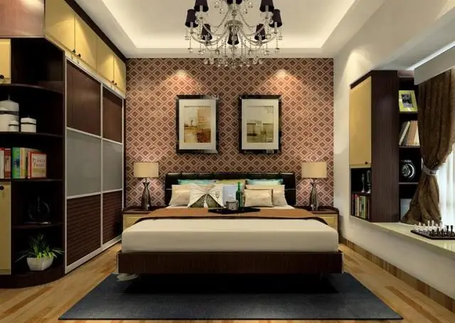 白色的特殊造型门板与挪威胡桃相搭配,合理的柜体布局使空间更加彰显大气之感。衣柜留出一个空间设置转角书桌,让有限休憩空间还能增加一个工作区。