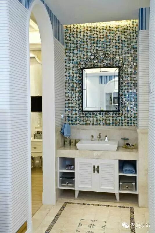 洗手台很好的利用了主卧与洗手间中间的通道的空间。墙面上和地面上都装上了马赛克瓷砖,色彩活泼,让人感到放松。