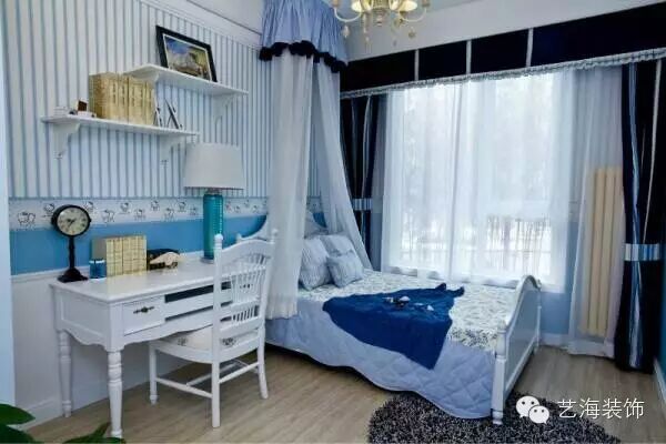 次卧是个公主房,浅色蓝白条墙纸运用得很好。