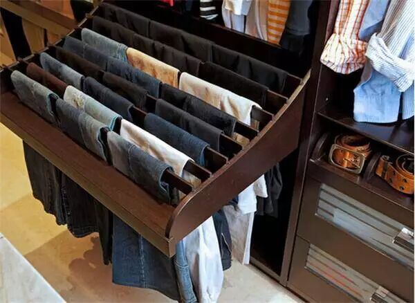 巧克力色的木质收纳裤架,可以让容易起皱的裤子保持平整亮洁,更易收纳。