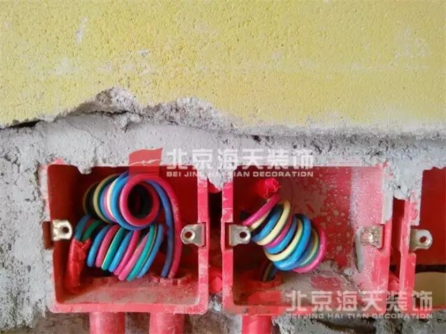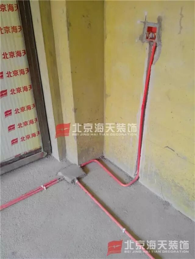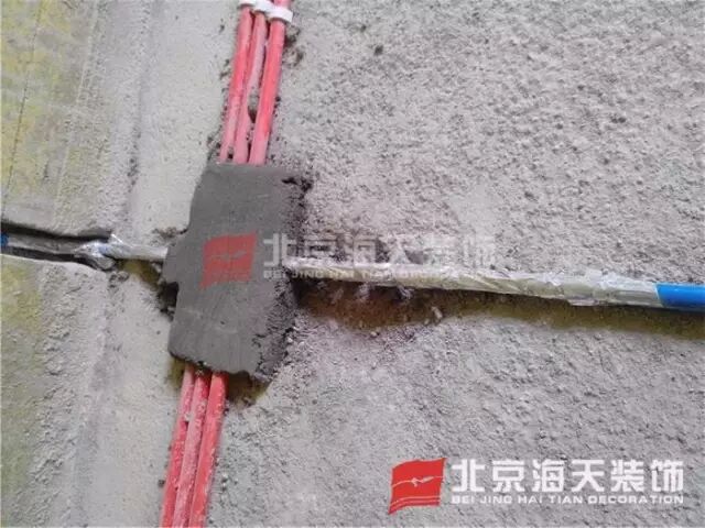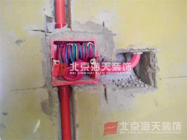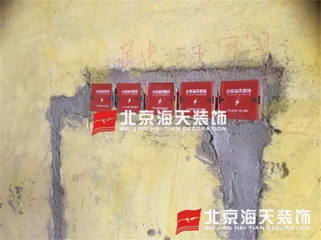 ▲所有的墙面开槽,等电线管布局完成之后都会用水泥进行填缝,接线盒也会用带有海天装饰logo的盖板盖上,确保安全施工和美观。