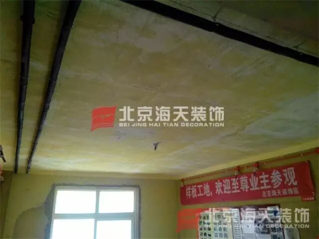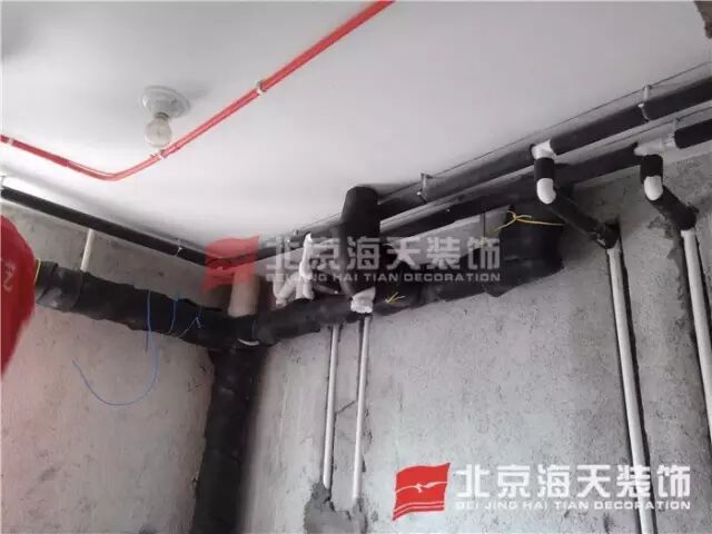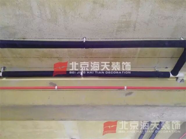 ▲水管走顶是海天装饰水路改造的硬性要求和区别于其他装修公司水电改造的一大特征。走顶的水管套上保温棉一方面起到很好的保温隔热作用,另一方面也有效防止冷凝水的出现。