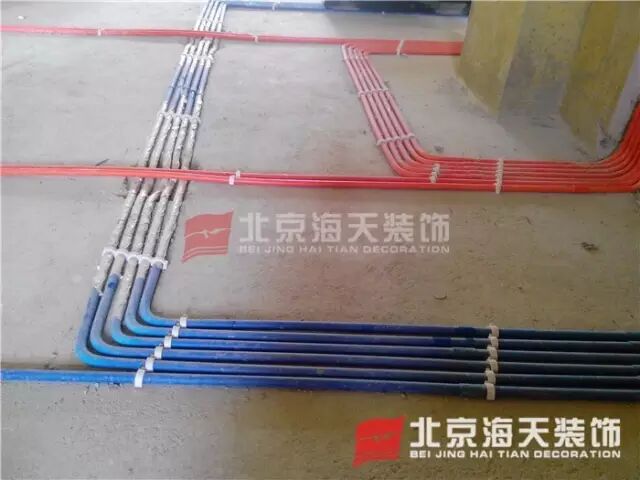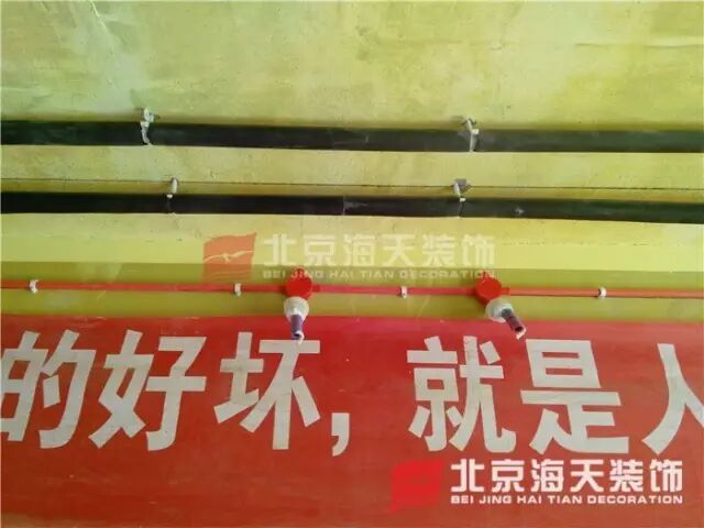 ▲水管施工过程中,冷热水管均使用热水管(因为热水管的管壁比冷水管更厚,耐压性更好)!无论是清晰的弹线还是标准的吊卡距离把握,都是海天人追求精细施工的高标准。