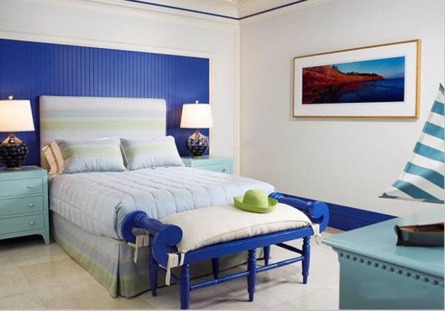 室内配以各种以蓝白色调为主的装饰品,太复杂的颜色搭配会破坏这种单纯感,亦没有别的色彩比这种颜色搭配更能为人们带来夏天的舒爽、凉意。