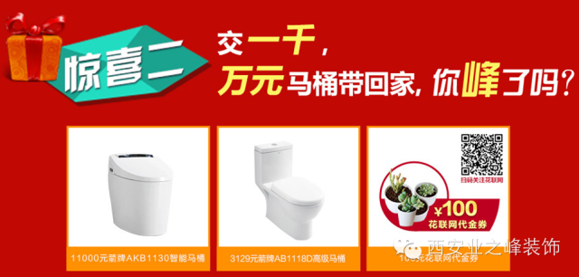 1.在业之峰装饰店面交纳1000元置换金即可参与抽奖,100%中奖,两种奖品,3129元箭牌AB1118D高级马桶,11000元箭牌AKB1130智能马桶,中奖率各为50%。