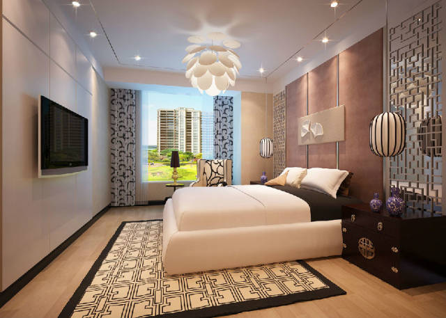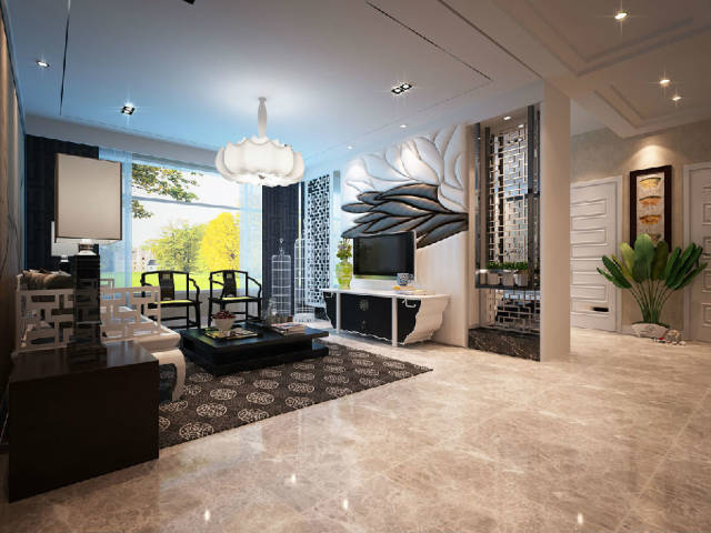 本方案在设计上,牢牢把握户型方正,南北通透,动静分区,私密性更好的特色,同样在舒适性上做足文章。独立的入户玄关更具仪式感,客厅和餐厅贯通小阳台,活动空间更加舒适。利用原有的设备平台增加了一个书房,利用地板抬高完美的将空间做了分割,敞开式的书房大大增加了视觉上的空间效果,电视背景左边的中式雕花隔断既起到了将空间风格的功能,有与右边的银镜磨花造型做到了相呼应。完美的呈现了中式的对称,雕花的中空使得空间有效的延伸,空间更朗阔舒适。选材方面,选用环保的实木护墙装饰,再配上无纺布墙纸点缀。还有具有造型的吊顶和灯饰辅助。配上中式的家具,孕育着浓浓的文化气息。通过荷花,中式花纹,地毯,家具花纹的色彩加以零星的点缀与调配,中国风得以浓郁彰显。
