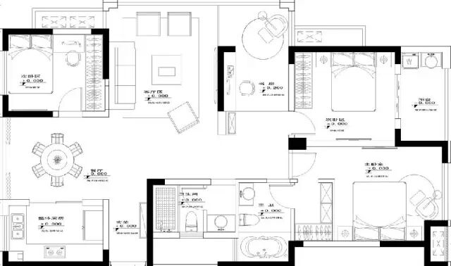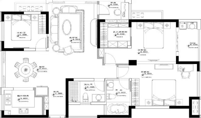 本方案为了突出舒适性,在布局上做了一定的取舍,蒋本可以做成四房的空间,“只”做成了三房。原有客厅和餐厅空间变大。把原有的设备平台改成了一个书房和一个独立的走入式衣帽间,大大增加了收纳功能,书房的门使用隐形门设计,在不破坏客厅电视背景墙造型的前提下,使得背景墙完整美观。选材方面,选用环保的实木护墙板,再配上无纺布墙纸点缀。还有具有造型的吊顶和灯饰辅助。配上古典的欧式家具,孕育着浓浓的贵族气息。通过装饰画,地毯,家具花纹的色彩加以零星的点缀与调配,舒缓了视觉效果,使空间出现层次的变化,更富灵动气韵。