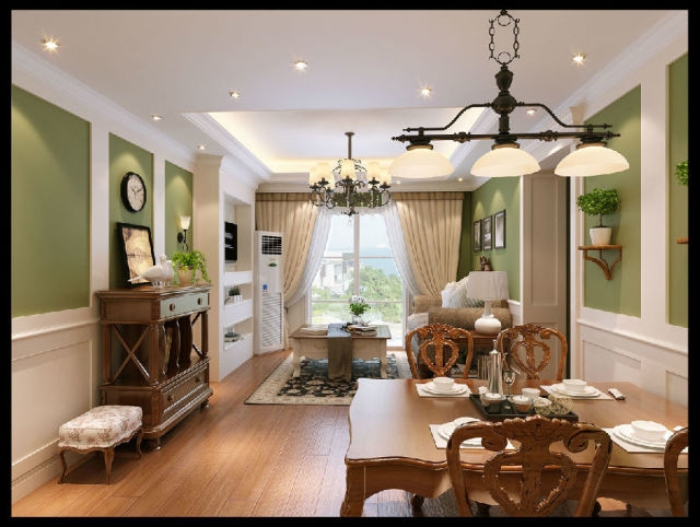 本套方案将原有的厨房变成了敞开式的同时,设计了一个入户独立的玄关,利用原有的设备平台增加了一个书房和走入式衣柜,大大增加了收纳功能,精致的三房设计,空间利用率非常高。客厅餐厅一体,融合空间更享生活的融洽。选材方面,美式惯用的护墙板、彩色乳胶漆、墙纸等材料,以及柔和的奶白色的大量使用,给人以明快的、不造作之感。另外美式乡村风没有豪华的排场,喜选用精致的装饰品和摆设不用时期的家具来营造氛围,面部材料的沙发、抱枕及窗帘等饰品的运用突出了自然的舒适之感。