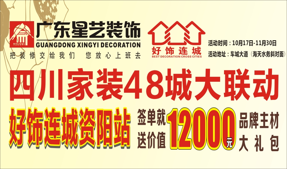 为响应集团号召,资阳星艺装饰将于2014年10月17日—11月30日在资阳市车城大道雅香居(海天水务斜对面)开启“好饰连城”四川家装48城大联动资阳站活动,这也是星艺装饰装饰入驻资阳市七年以来,为了回馈我们资阳人民,特地做的一次大型活动,签单就送12000元品牌主材!