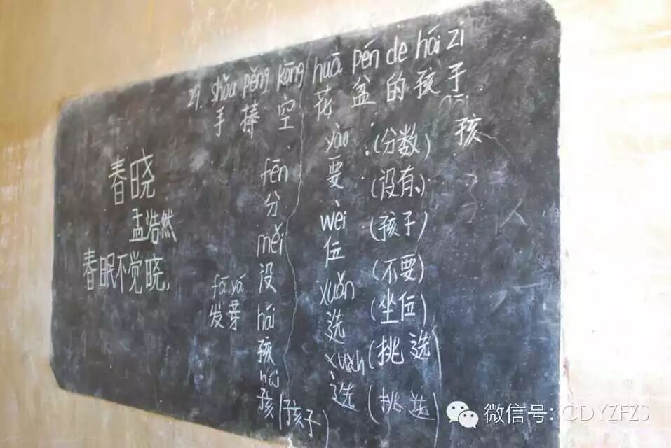 在一间简陋的教室内,学生上课用的书本是旧的、穿的衣服上打着很多补丁。可是他们的目光里却闪烁出对知识的渴求。