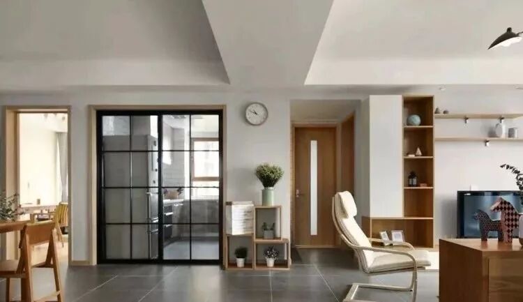 为了让家里的视线不受阻隔又能隔除油烟,因此选用了最近很流行的黑框玻璃做隔断,