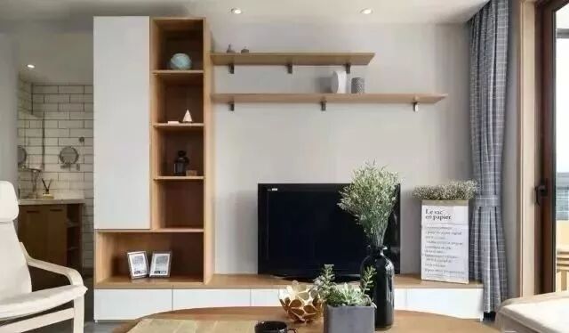 电视背景墙属于成品实木颗粒板订制,用隔板架作为装饰的同时更是增加了储物空间,