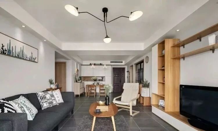客厅电视背景墙是现场定制的组合柜,客餐厅地面采用卡布奇诺深灰色地砖,增加了与家具的木色感对比。