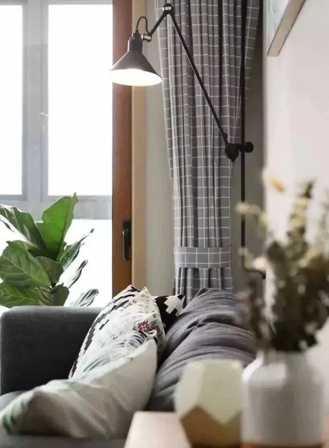 客厅沙发边上搭配灰白色格子窗帘,在沙发旁边特意放了黑色挂壁式的阅读灯,方便晚上的娱乐活动
