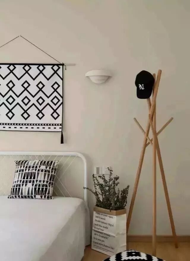 配上低矮的白色钢架床与树枝衣架,是当前很受欢迎的网红卧室搭配,整体感觉超级赞。